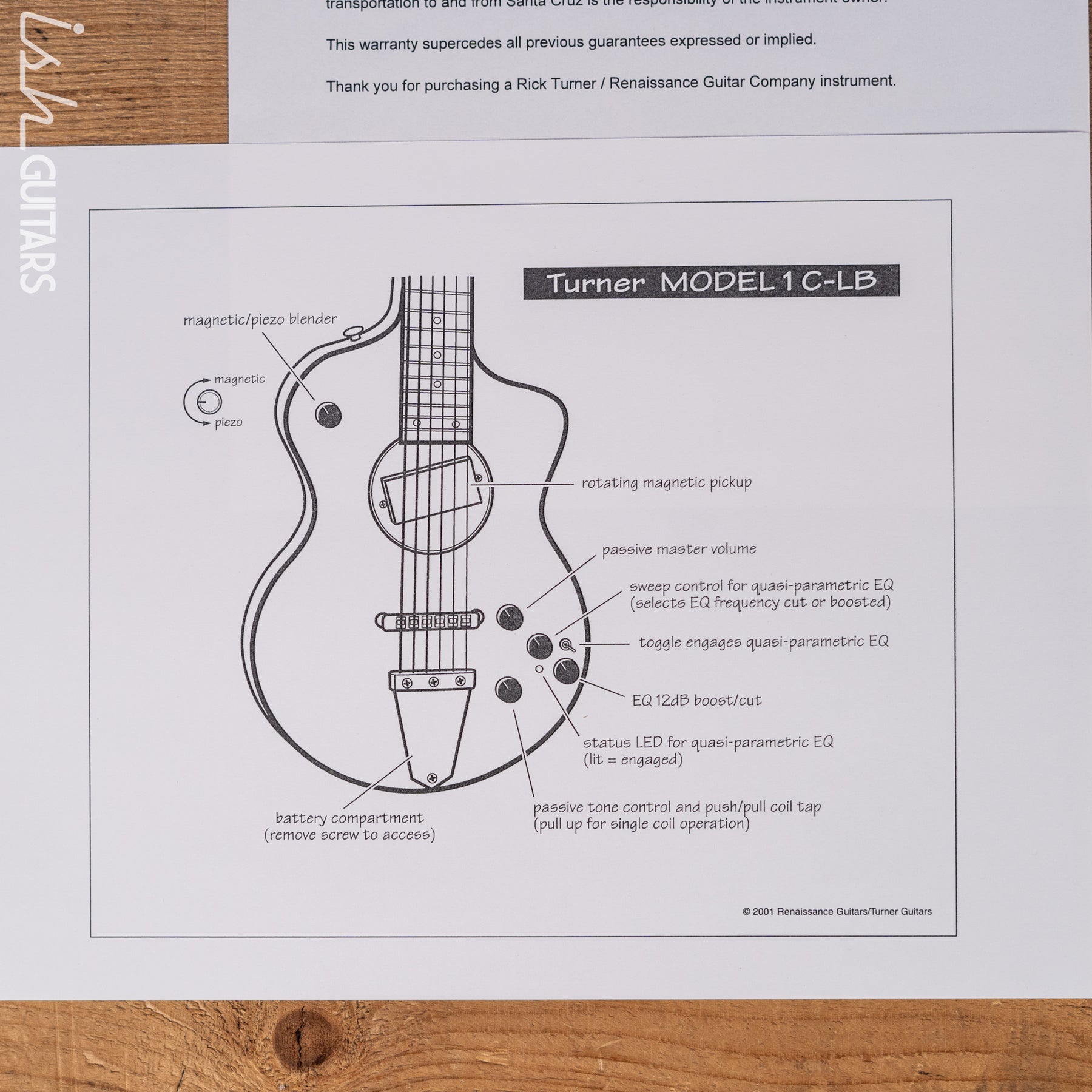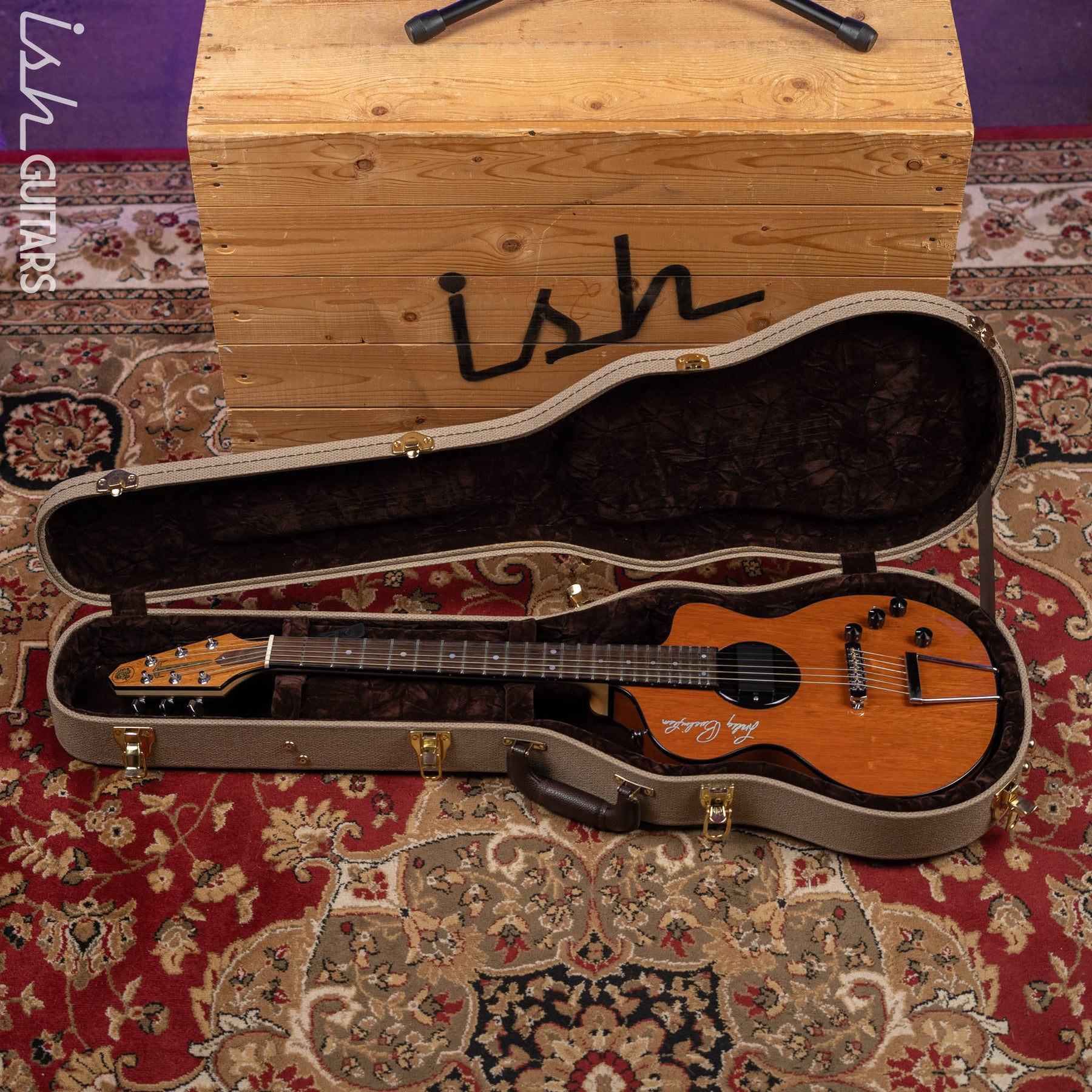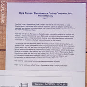 Case Details: Original Hardshell Case. Includes coa, stencil/outline of guitar plans, making of the rick turner guitar book.