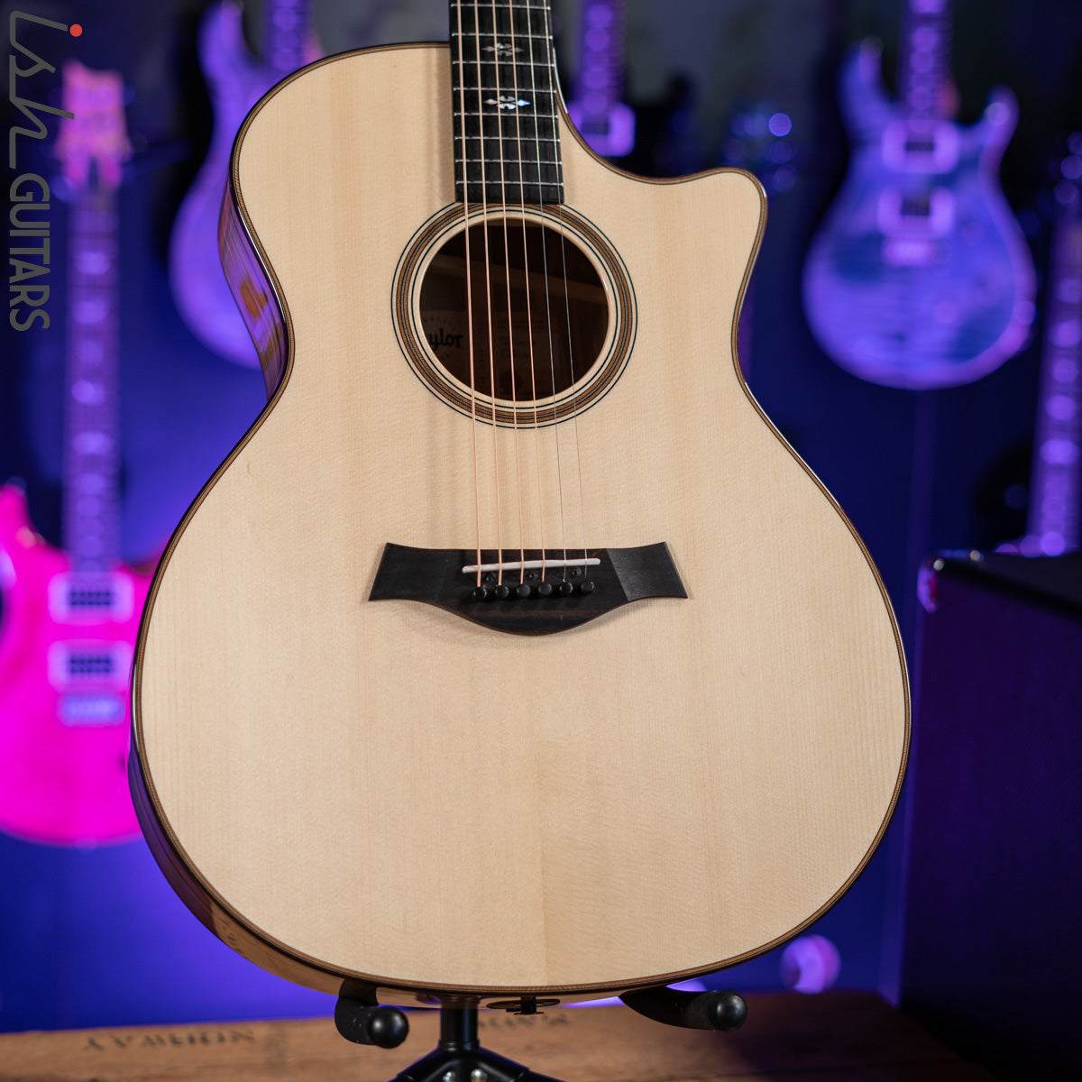 Each of these limited-edition Grand Auditorium models boasts boldly unique visual character, thanks to the striking sets of blackheart sassafras selected for the back and sides. The blond heartwood is naturally accented by contrasting olive, black and chestnut-brown coloration. Musically, sassafras blends the midrange warmth of mahogany, the top-end sparkle of rosewood, and the clarity of maple into a player-reflective voice that responds well to the nuances of a player’s attack. The Lutz spruce top and V-Class bracing bring impressive power, sustain and dynamic range to the sound. Noteworthy appointments include rosewood binding and back strip, maple/black/Douglas fir herringbone top edge trim, a Douglas fir herringbone rosette, “Reflections” fretboard/peghead inlays in pale green abalone, a gloss-finish body and Taylor smoked nickel tuners. The guitars also feature a Venetian cutaway and onboard ES2 electronics, and ship with a Taylor deluxe hardshell case.