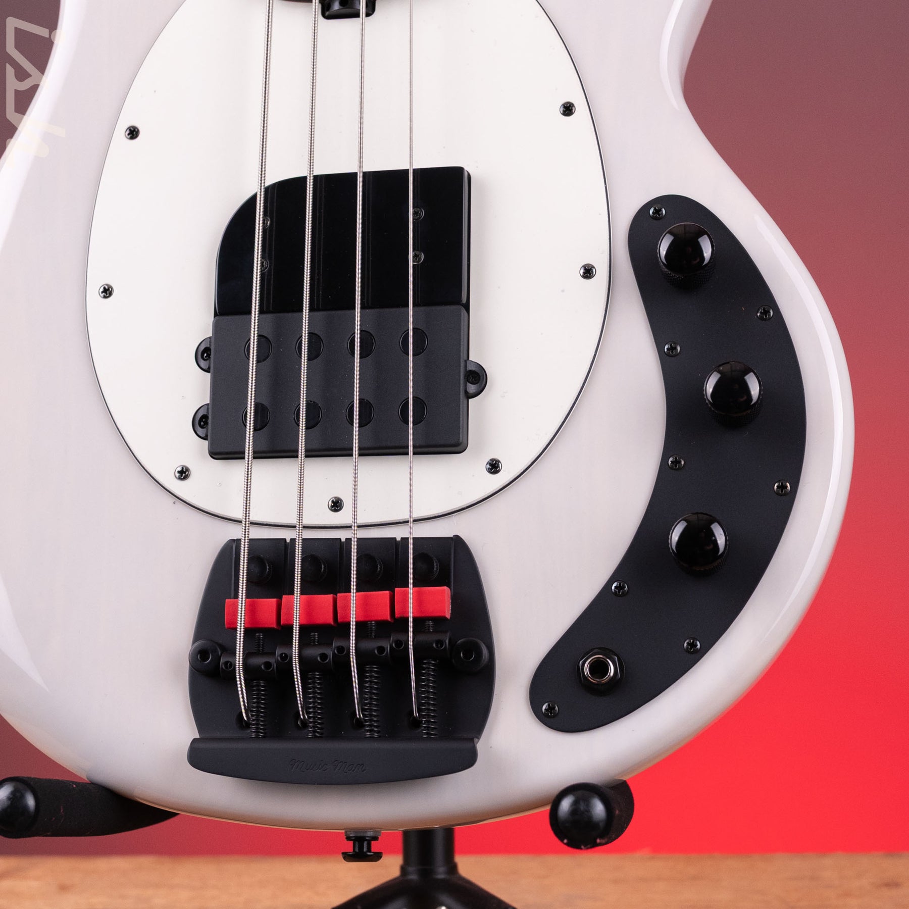Bridge/Tailpiece: Music Man® strings-thru-the-body with hardened steel bridge plate, vintage steel saddles, and red adjustable mute pads