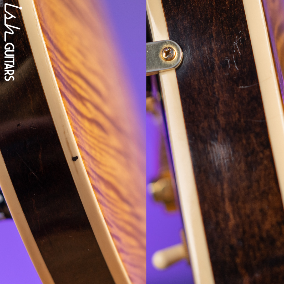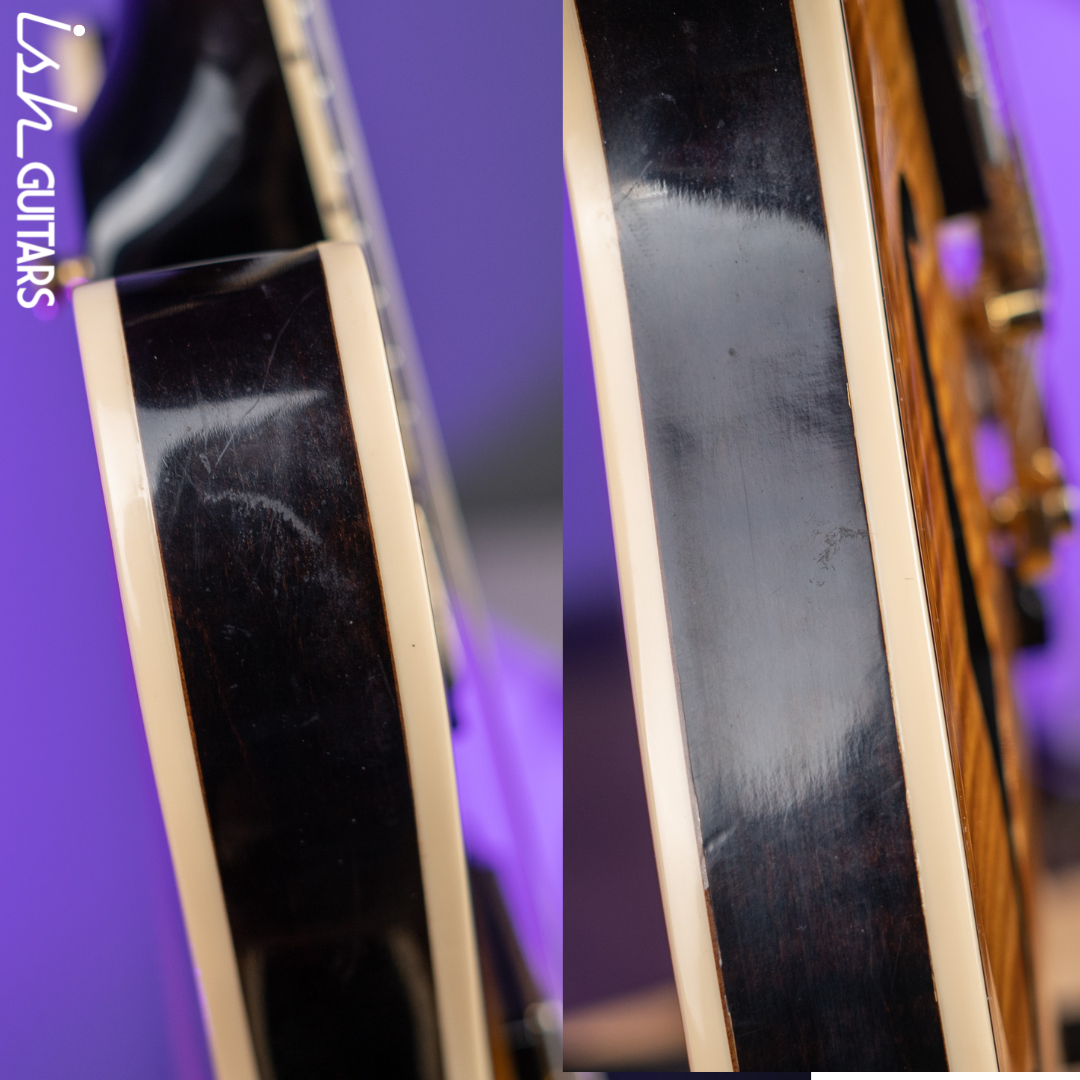 Cosmetic Condition: Very good condition with some scratching throughout as well as a few areas of minor indentations/deeper scratches that can be seen in our listing photos. Some chipping on the headstock as well as some finish imperfections where the neck meets the headstock.