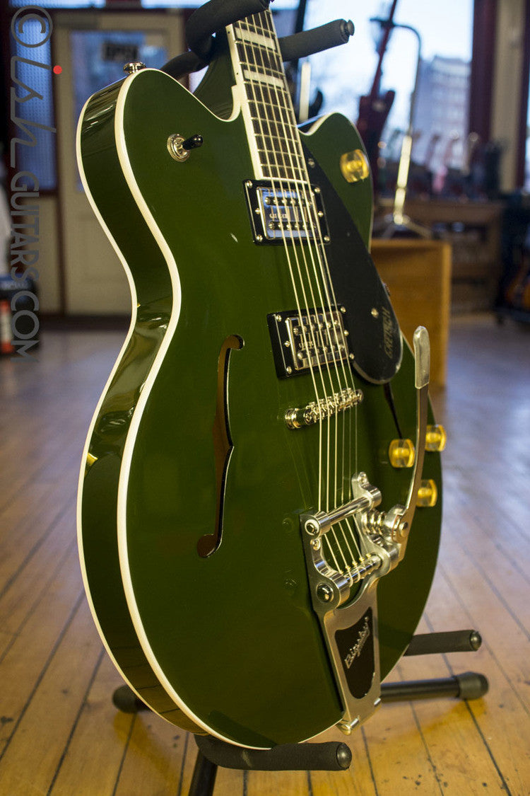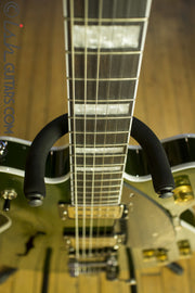 The secret to the Streamliner’s sound is twofold—the Broad’Tron humbucking pickup and the spruce center block. Specifically designed by the expert engineers at Gretsch for the Streamliner, this high-output pickup spawns robust lows, pristine highs and a throaty midrange for a unique tone that blends well with other instruments in a band context. A lightweight spruce center block runs the length of the body, reinforcing the top while eliminating undesired feedback for volume-friendly performance on rocking stages. The Streamliner’s sonic power is harnessed and shaped by the traditional control layout—neck and bridge pickup volume controls, a master tone control, master volume control and three-way pickup switching. A fast-playing 12”-radius rosewood fingerboard with elegant pearloid block inlays and 22 medium jumbo frets sits atop the white-bound nato neck with a thin “U”-shaped profile—ideal for chord work or fiery riffing. Add some shimmer and expression to your playing with the Bigsby-licensed B70 vibrato tailpiece while the Adjusto-matic™ bridge with anchored base and synthetic bone nut grant astounding tuning stability and accurate, slip-free intonation.
