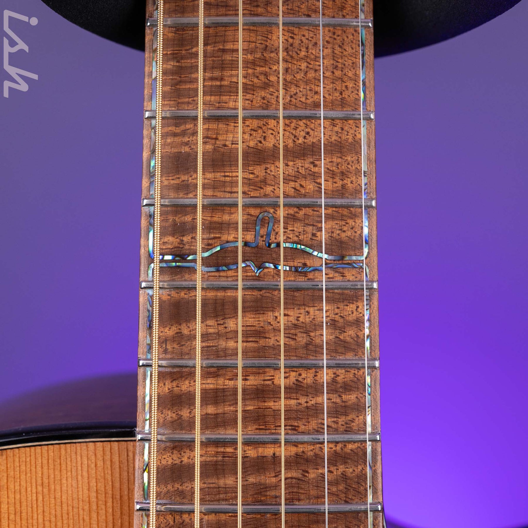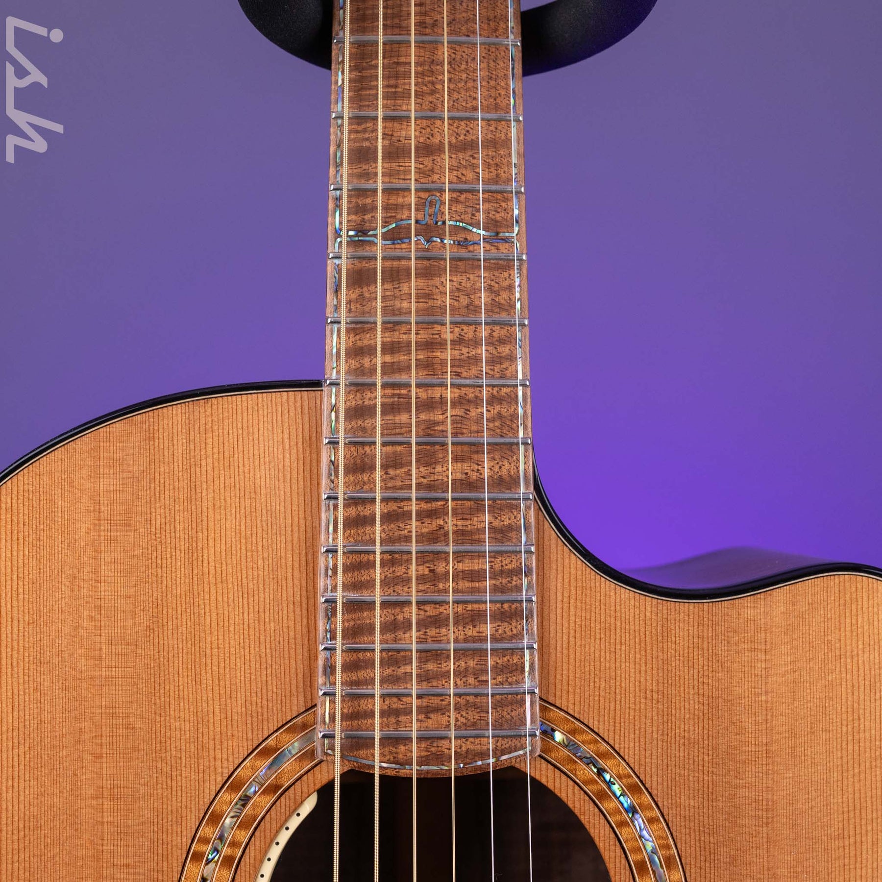 Fingerboard inlays: Paua outline Coopers Hawk at 12" fret and Paua purfling
