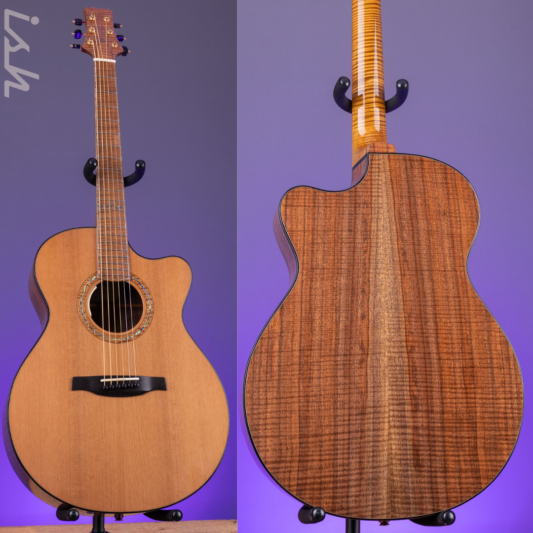 Specials: Natural High Gloss Nitro finish, Cedar top with Ebony binding and Black/ Maple/ Black purfling, Walnut back & sides with Ebony binding and Black Maple/ Black purfling, Curly Maple neck, Roasted Curly Maple fingerboard & headstock veneer, Paua/Roasted Curly Maple Rosette, Ebony Endwedge, Paua outline birds and purfling, Gold hardware and features an adjustable truss rod.