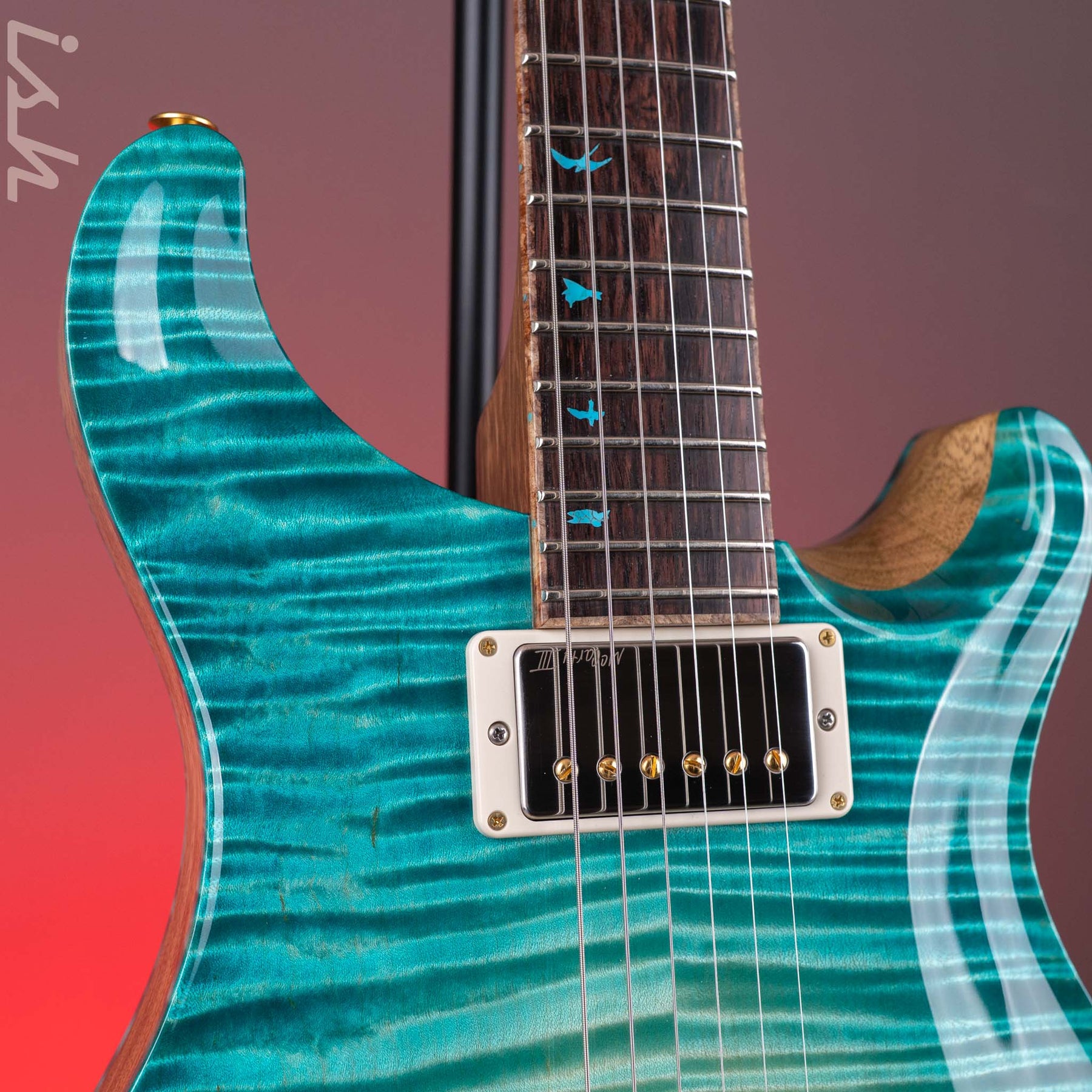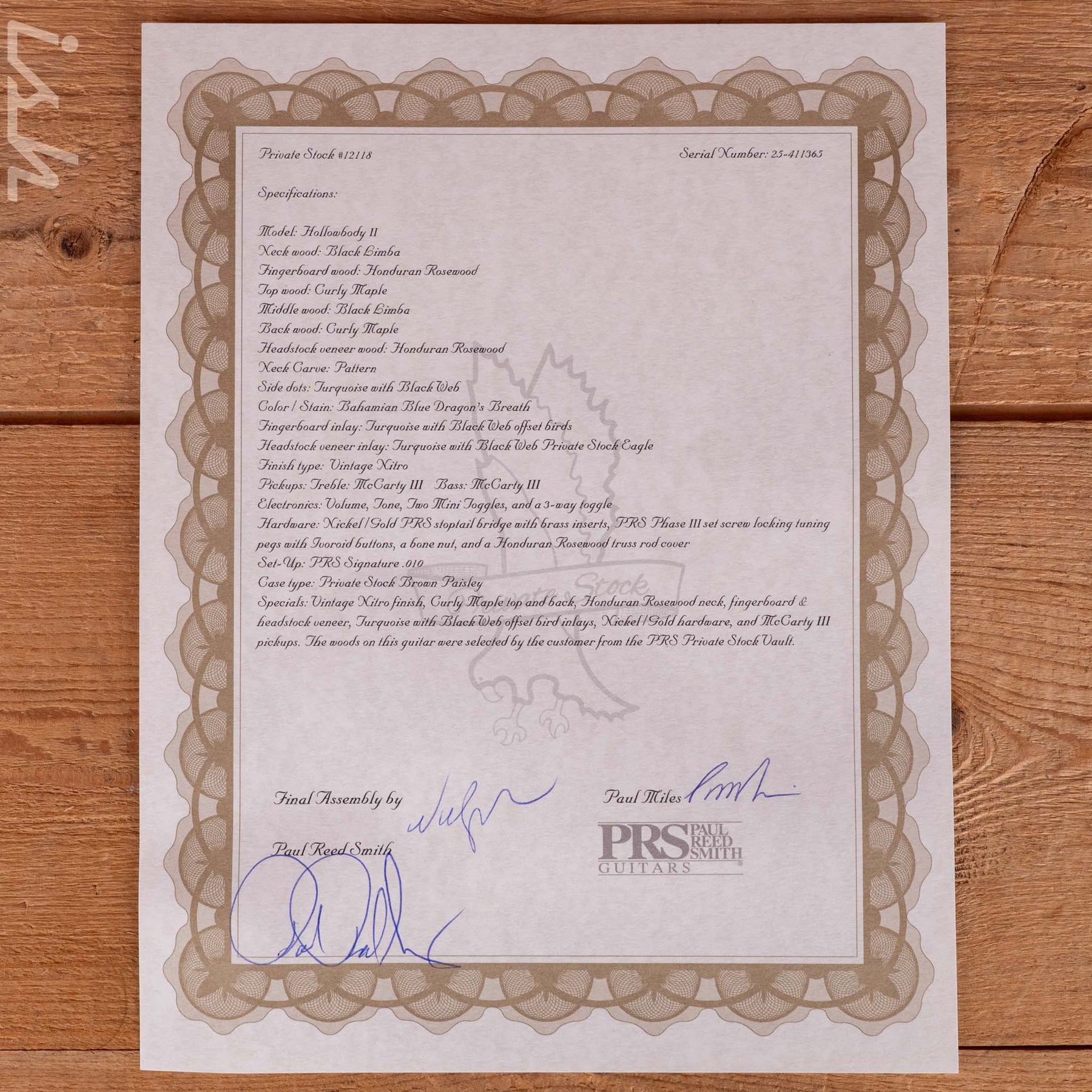 Specials: Vintage Nitro finish, Curly Maple top and back, Honduran Rosewood neck, finger board & headstock veneer, Turquoise with Black Web offset bird inlays, Nickel/Gold hardware, and McCarty III pickups. The woods on this guitar were selected by the customer from the PRS Private Stock Vault.