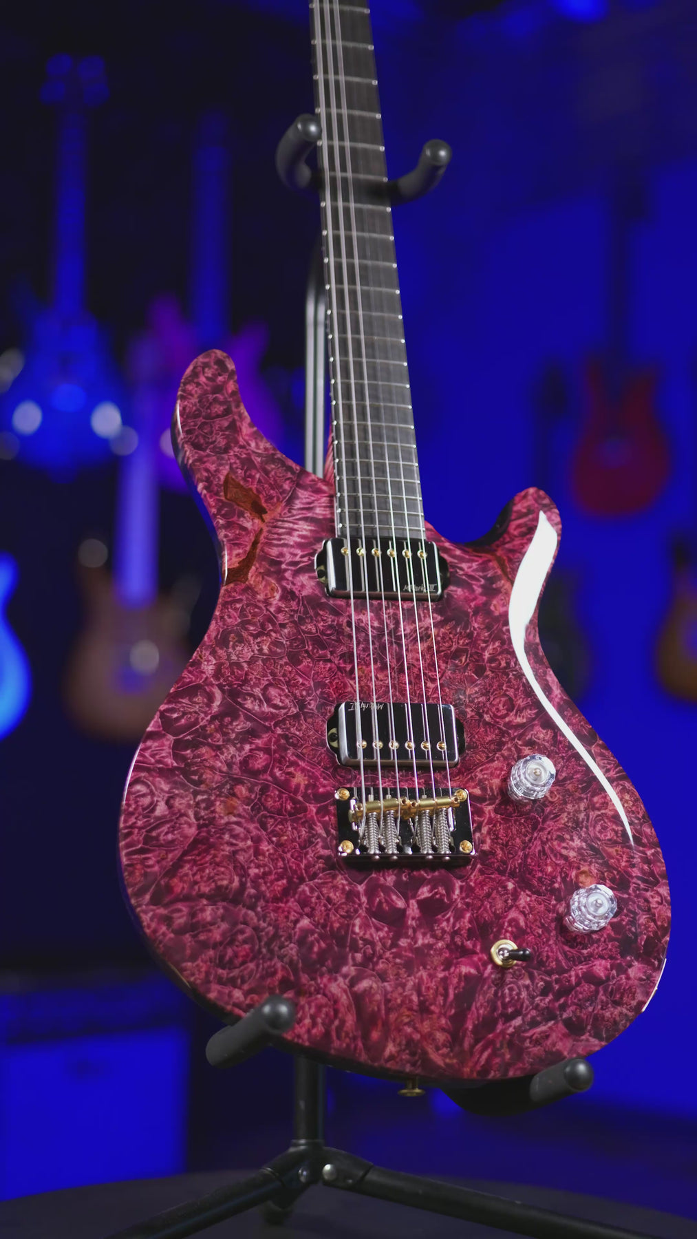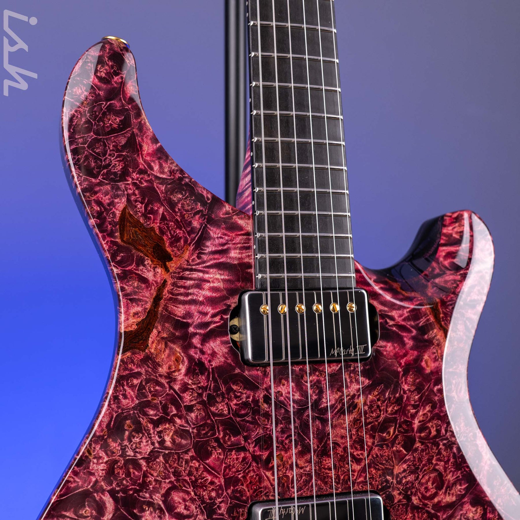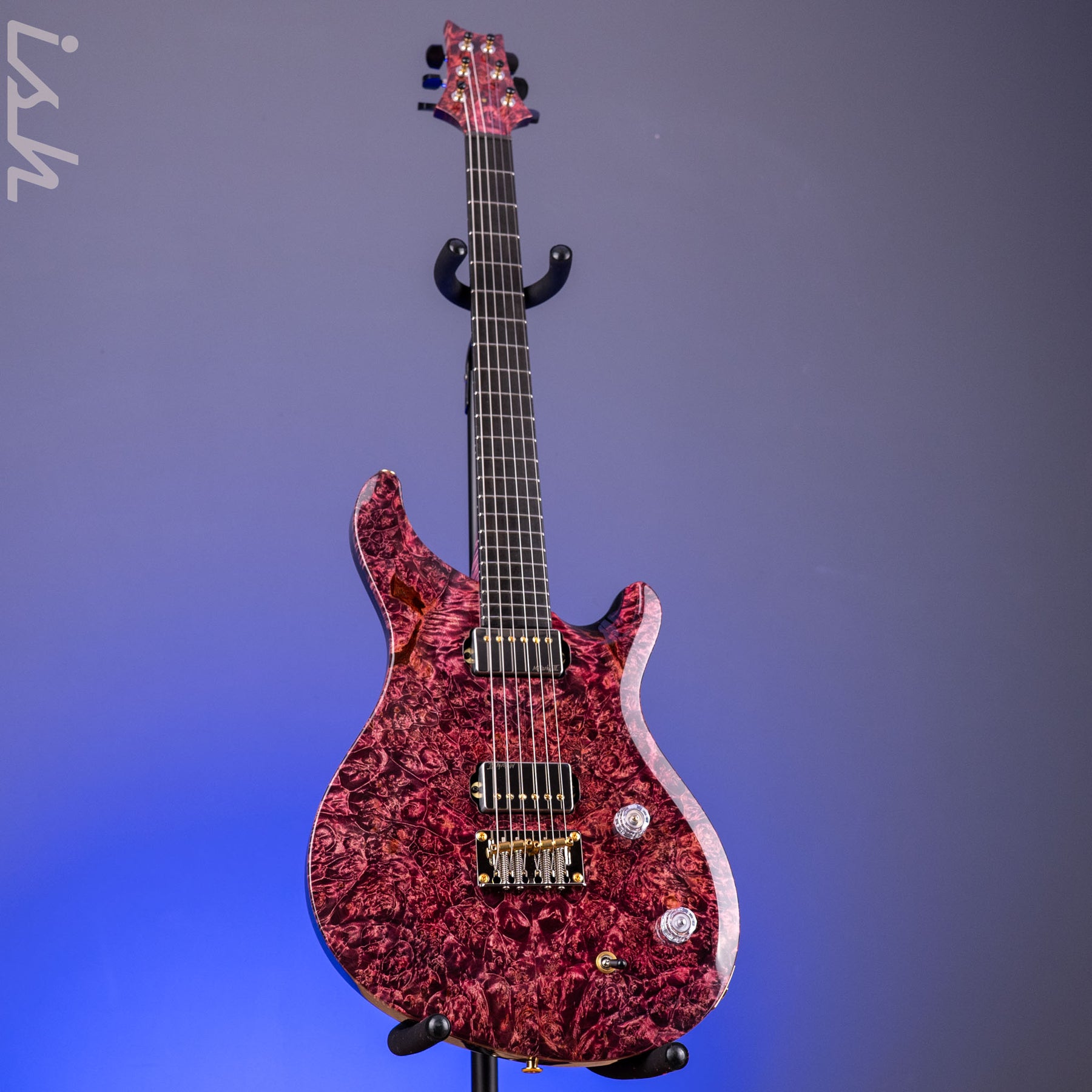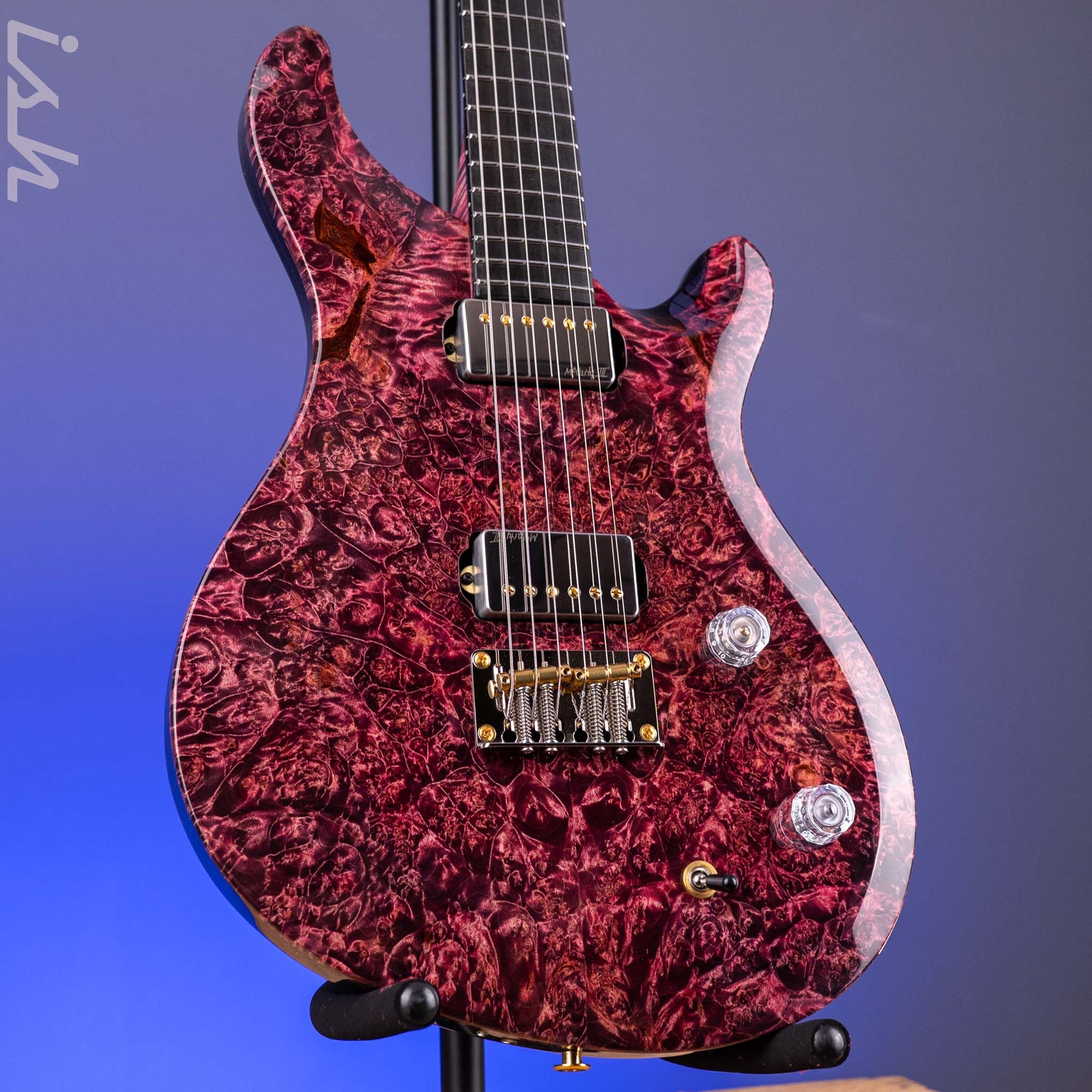Specials: High Gloss Nitrofinish, Maple Burl top, Swamp Ash back, Bird's Eye Maple neck, Ebony fingerboard, Dark Red Coral stone Private Stock 'J' Eagle, Gold /Nickel hardware, and features direct-mount McCarty Ill pickups.